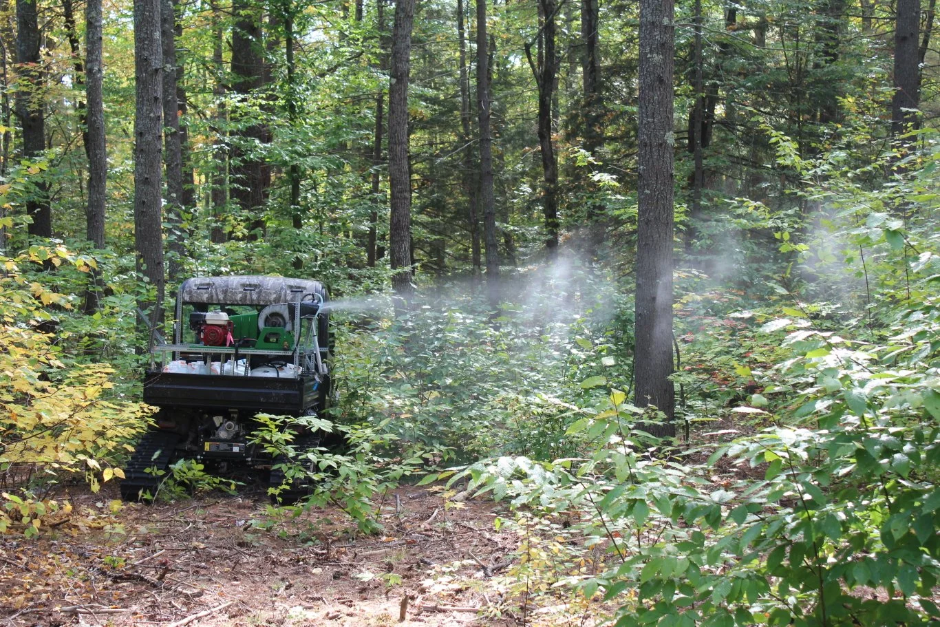 We use a variety of methods of herbicide application to control these species. Scattered instances of small invasive bushes can be treated by foliar application with hand-pump backpack sprayers, which can also apply basal oil to treat the stems of especially tall bushes and vines. Denser areas of invasives or undesirable hardwoods are treated with mechanized backpack mistblowers. For the broadest-scale treatment of large areas, we have invested in a Kubota utility vehicle which carries a mounted mistblower and up to 50 gallons of herbicide. The mounted mistblower can spray out to 30-40 feet, and the UTV rides on aftermarket tracks, rather than wheels, which provide better traction and flotation on soft soils.
